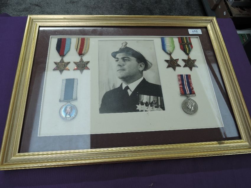 A framed and glazed Medal Display to JX158547 P/Off W.B.SMITH, HMS DRAKE, 39-45 Star, Africa Star, Atlantic Star and Pacific Star with Burma Clasp, War Medal and Royal Naval Long Service and Good Conduct Medal ERII, along with portrait photograph