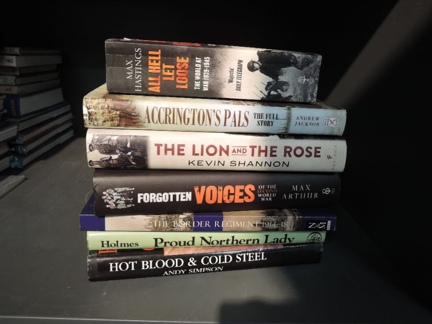 Seven Military History Books including Accrington Pals, The Lion and the Rose etc