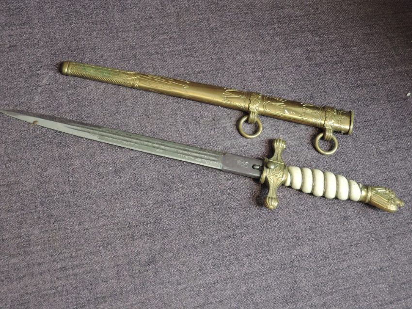 A German Third Reich Kriegsmarine Naval Officer's dagger with metal scabbard, blade engraved with Anchor and decoration to both sides, plastic grip with silver wire, blade marked with a Squirrel and inscribed 'Original Eickhorn Solingen', blade length 24.5cm, overall length 38cm