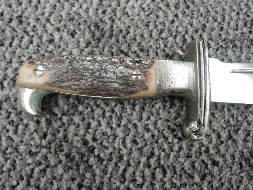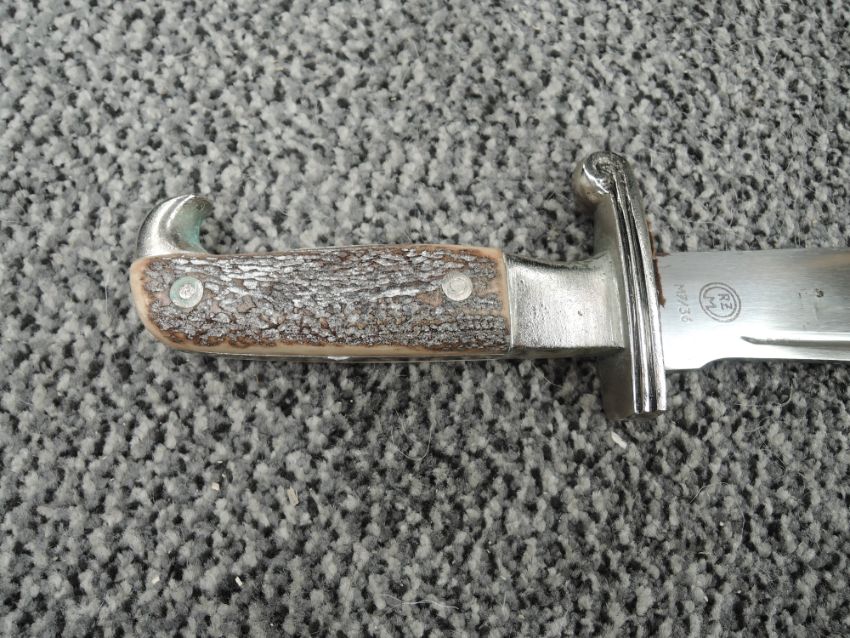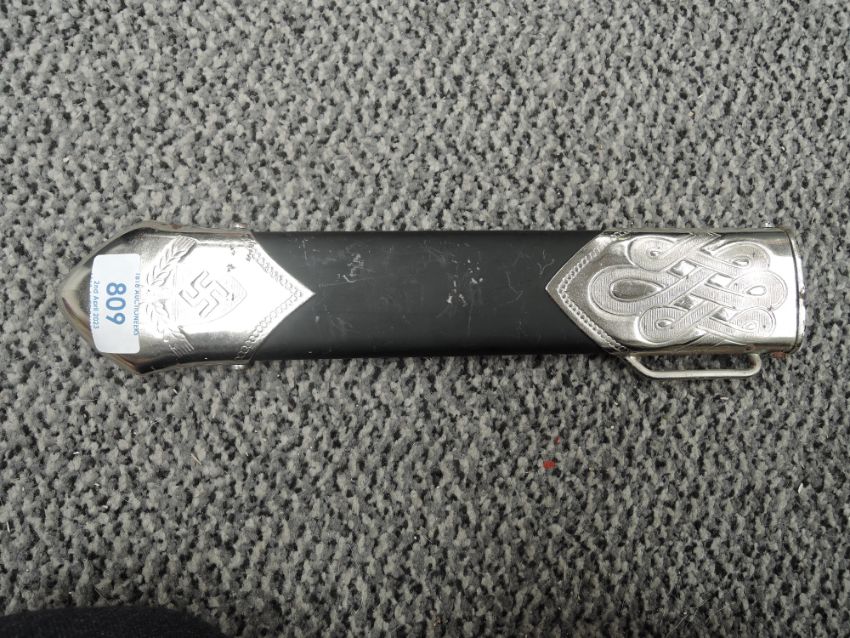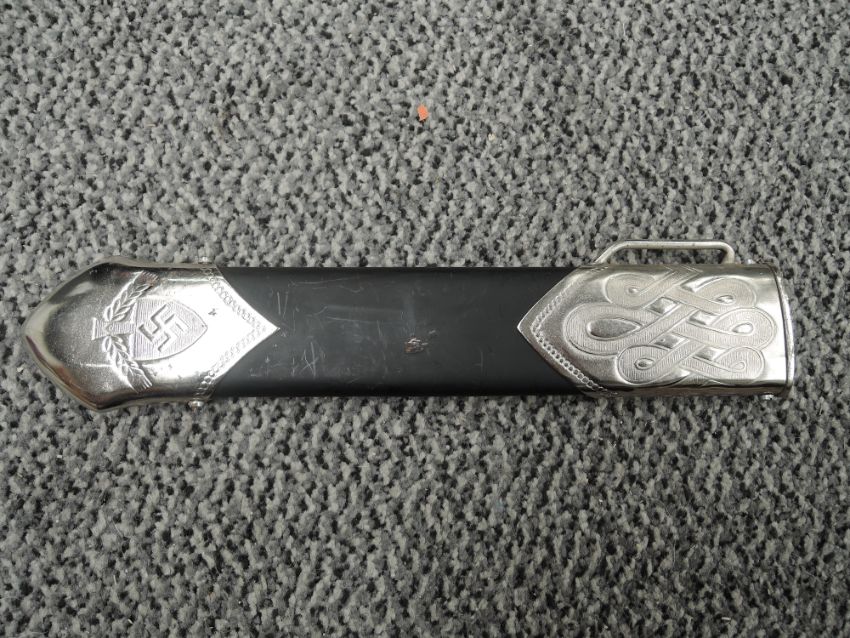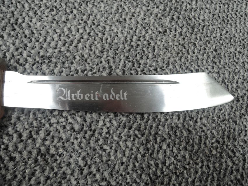 A German WW2 RAD (Reich Labour Service)Hewer 1934 having horn grip with eagle head, single edge blade, blade marked ARDEIT ADELT (Labour Ennobles), RZM in circle M7/36, in black metal and plated Scabbard, blade length 25cm, overall length 37cm