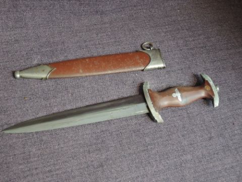 A German WWII SA Service Dagger 1933 with brown scabbard, brown grip, blade marked Alles Fur Deutschland, reverse marked FW Holler, Solingen RZM in circle M7/33, National Service and SA marked to grip, blade length 22cm, overall length 34cm