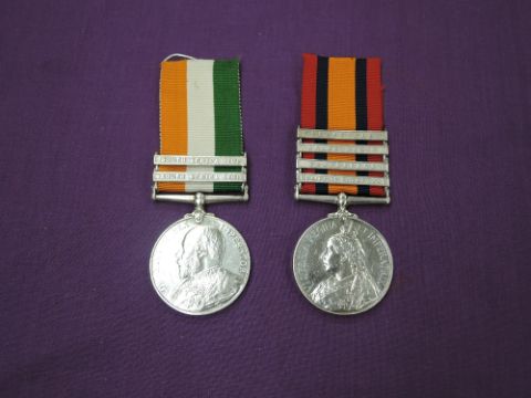 A Queens South Africa Medal with four clasps, Transvaal, Driefontein, Paardeberg and Relief of Kimberley along with Kings South Africa Medal to Capt.A.J.Chambers.R>A>M>C having two clasps South Africa 1901 and South Africa 1902, engraved naming