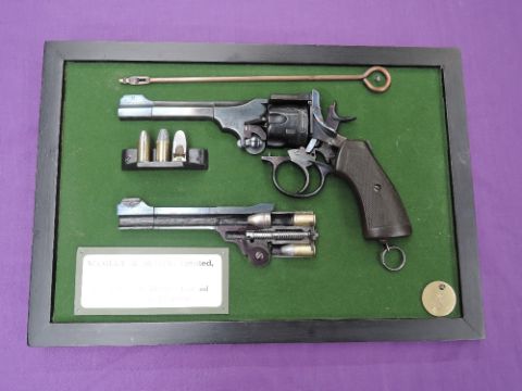 A shop display Webley & Scott Mk IV 1915 Revolver having military marks, cut away to show working parts, cut away bullet in frame, Webley & Scott, Limited manufacturers of Guns, Rifles, Revolvers and Automatic Pistols, parts diagram on reverse