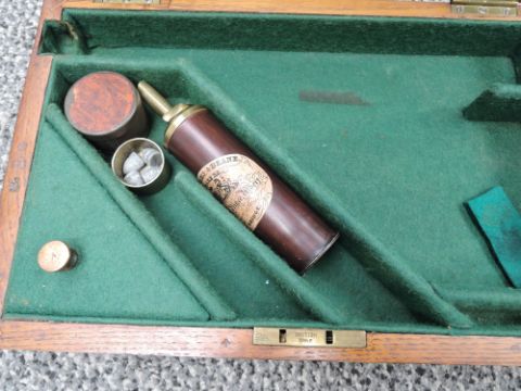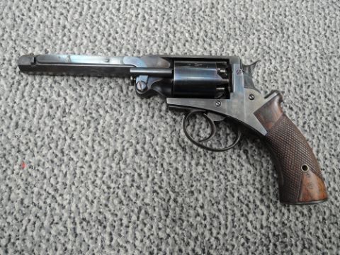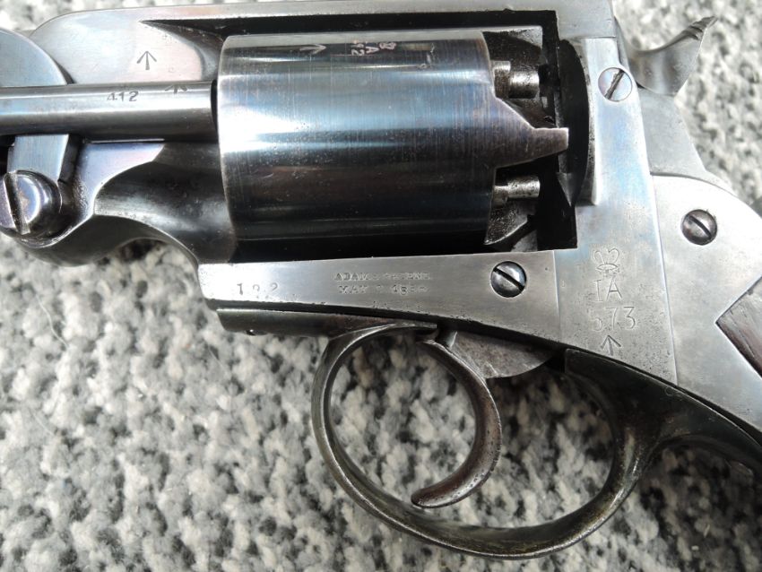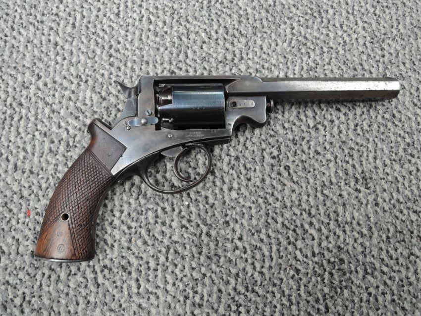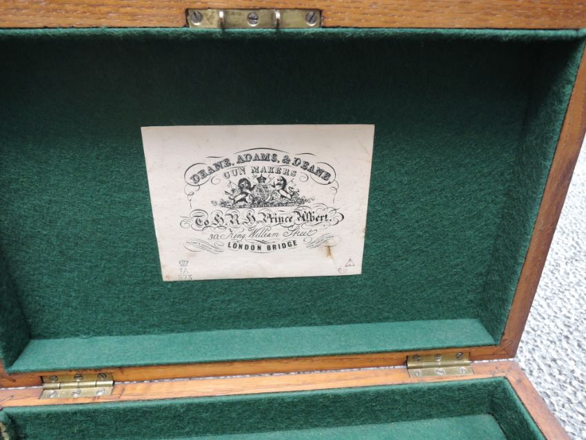 A Great Britain Adams Percussion Five Shot Revolver having chequered wooden grip, Military Marks, Adams Patent May 3 1858 on one side , Patent June 3 1855? On other side, Proof Marks seen, in fitted wooden case including Powder Flask etc