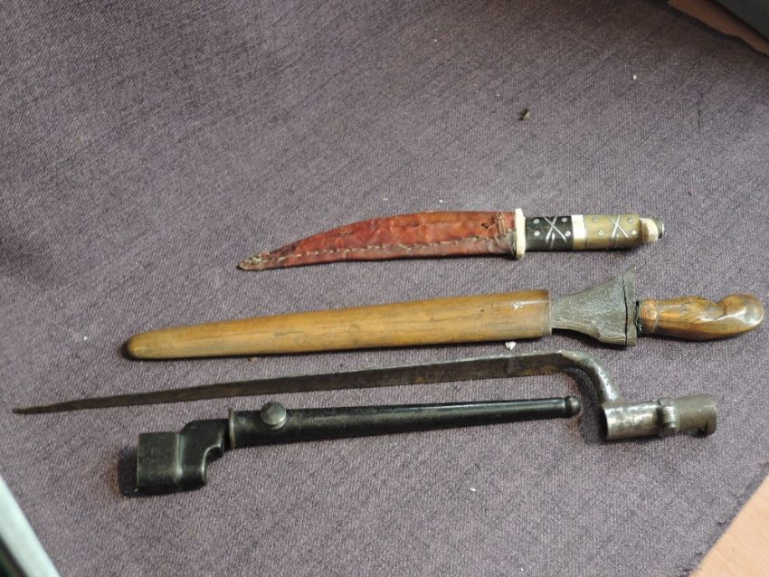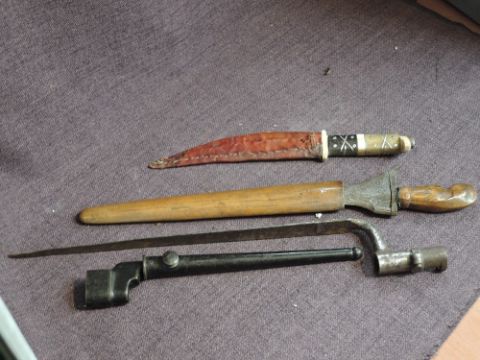 A French Bayonet, possible 1777 pattern, no scabbard along with a British Bayonet for the No4 Rifle, no4 MKII 1940 with Scabbard, a Indonesian Kris Dagger in wooden scabbard and another knife having wooden handle and leather scabbard