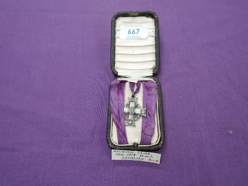 A Canadian Memorial Cross to 75626 SGT.C.J.EVERITE, 29th Bn, Killed in Action September 15th 1916 aged 29, MR 23 Vimmy, in box with ribbon