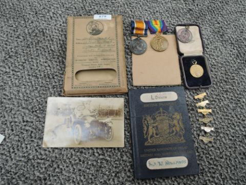 A WW1 Medal Pair to 66835 PTE.W.ROWLANDS.Lanc.Fus, War Medal and Victory Medal along with British Passport and Postcard, a 1928 9ct Gold LMS Amblance Centre Medal for long service named toC Rowlands with six clasps, two being hallmarked, in case and a Shooting Medal