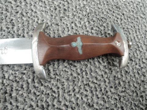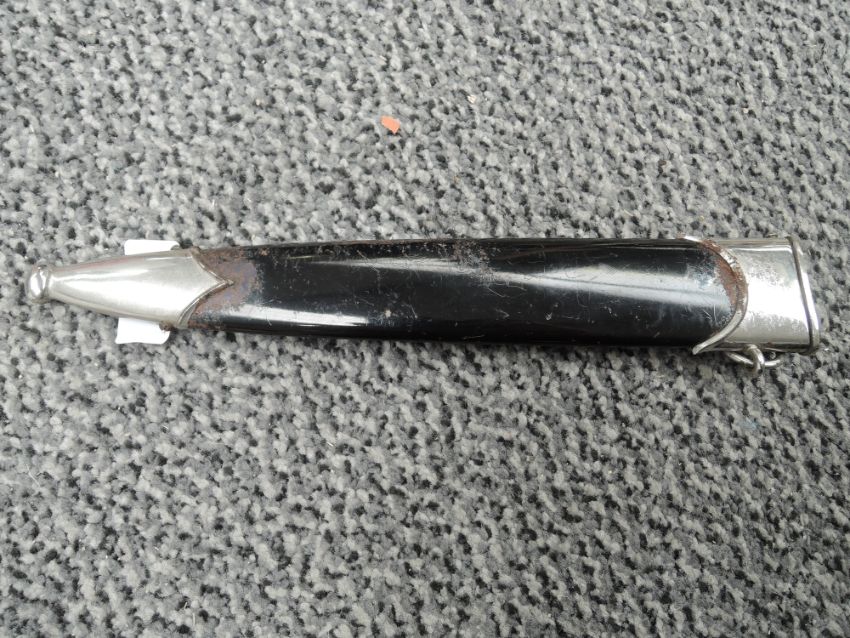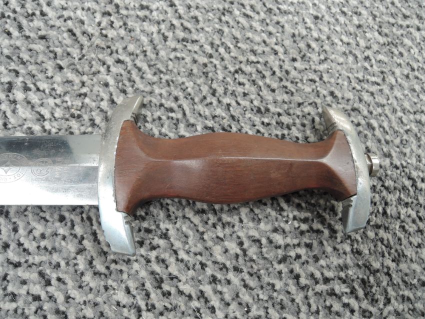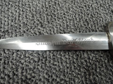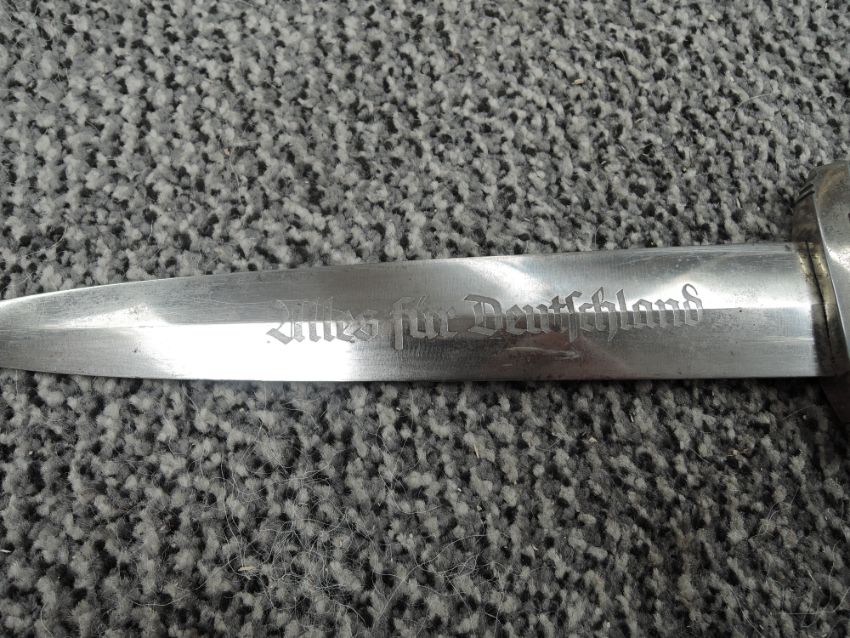 A German WWII SA Service Dagger 1933 with black scabbard, brown grip, blade marked Alles Fur Deutschland, reverse marked Rich.ABR.Herder, Solingen RZM in circle M7/18 1940, National Service and SA marked to grip, blade length 22cm, overall length 34cm