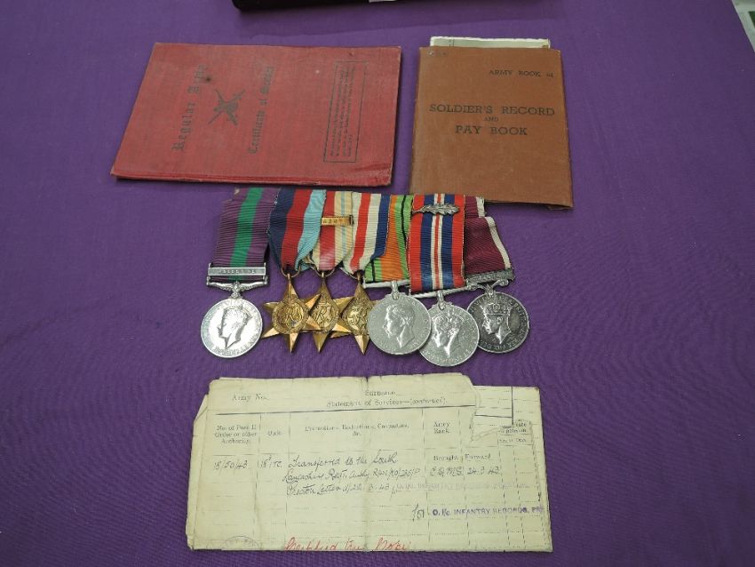 Seven WW2 Medals, S/3709241 CPL.G.Atkinson Kings Own on Palestine Medal, 3709241 C/SJT,G.M.Atkinson R.Leicesters on Long Service, medals include General Service Medal Palestine Clasp, 1939-45 Star, Africa Star 8th Army Clasp, France & Germany Star, Defence Medal, 1939-45 Medal with Oak Leaves (mention in despatches), George VI Regular Army Long Service & Good Conduct Medal. Mention in dispatches for distinguished conduct in operations against armed bands in Palestine on nights of 7/8 October 1939, along with Soldiers Record & Pay Books, Regular Army Certificate of Service
