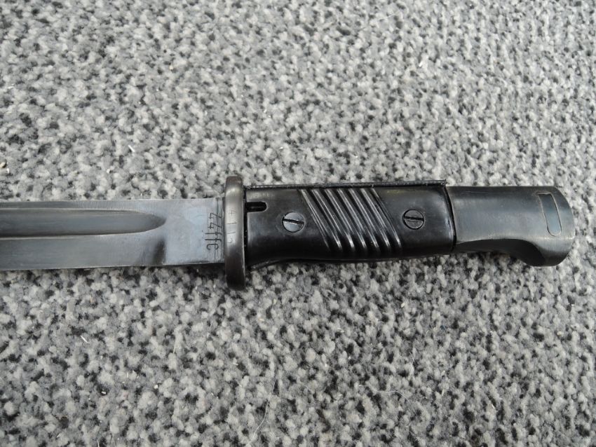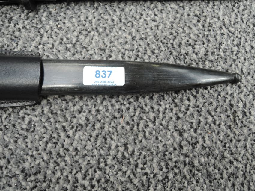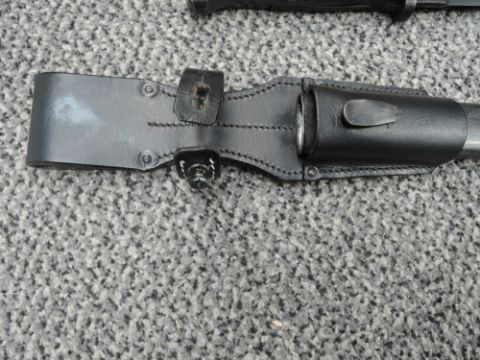 A German WW2 1937-45 black Bayonet with plastic grip, metal scabbard, leather frog No4115, 44FFC on blade