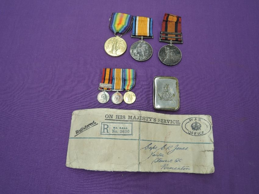 A Queens South Africa Medal to 2604.Sejt C.R.Jones W.Riding Reg with Cape Colony Paardeberg clasp, WW1 pair to Lieut.C.R.Jones War & Victory Medals and Miniatures along with Duke of Wellington Vesta Case