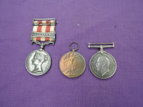 An Indian Mutiny Medal to LIEUT HON.C.C.MOLYNEUX.7th HUSS.rs with LUCK NOW Clasp, medal has several age related marks making naming difficult to read, C.C.Molyneux later went on to command the 10th Hussars, along with two WW1 Medals to Lieut Vicount Molyneux, War Medal and Victory Medal (3)