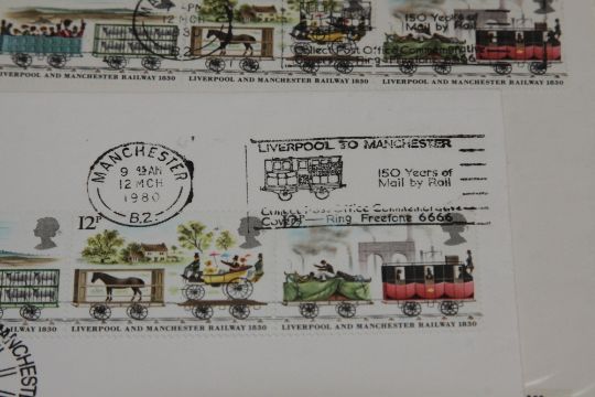 GB 1980 LIVERPOOL & MANCHESTER RAILWAYS, TRIO OF SLOGAN POSTMARKS, L'POOL & MAN Not often seen slogan postmarks for this 1980 issue. Always with additional FDI handstamps due to the slogan postmark only ever covering two values!