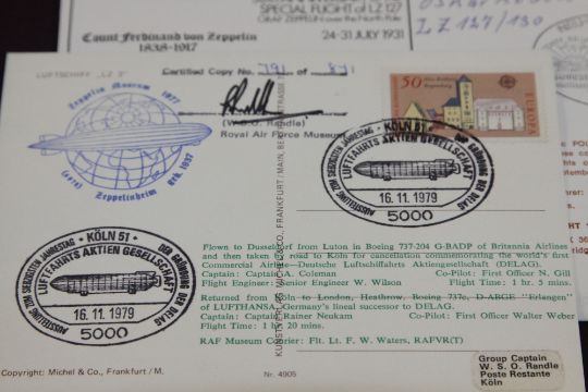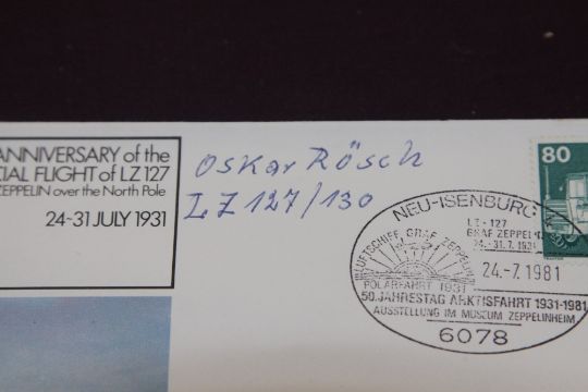 GERMANY 1979/81 ANNIVERSARY LZ 127 ZEPPELIN FLIGHT COVERS, 1 SIGNED BY ENGINEER OSKAR RUSCH Pair of interesting Zeppelin covers one depicting LZ3, signed by WSO Randle with multiple cachets. The other To commemorate the polar flight of 1931. Cover interestingly signed in ink by Oskar Rusch, who was an engineer and worked on the LZ127 in the 1920's/30's.