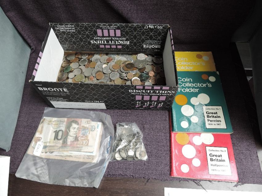 A collection of GB & World Coins in box and three Coin Albums including approx 4 oz of Silver Coins and a small amount of World Banknotes