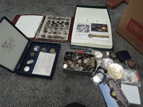 A large box of mixed World Coins including Coin Album with a small amount of Silver, Coin Covers, Silver White £5, various modern Medallions, Banknotes etc