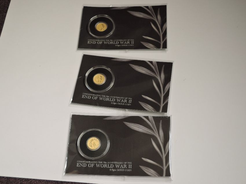 Three Perth Mint 0.5g Gold Coins, 2020 75th Anniversary of the End of World War II all in capsules on card in plastic wallets
