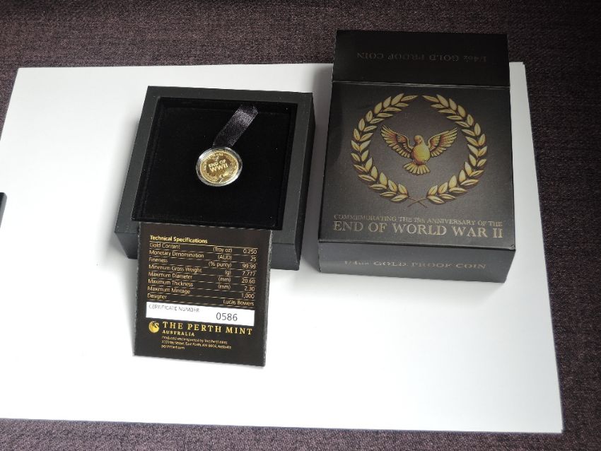 A Perth Mint 1/4oz Gold Proof Coin, 2020 75th Anniversary of World War II, limited edition 0586/1000 with certificate, box and outer card box
