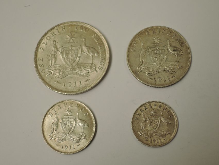 A set of four 1911 George V Australian Silver Coins, Florin, Shilling, Sixpence and Threepence, in our opinion these coins are uncirculated