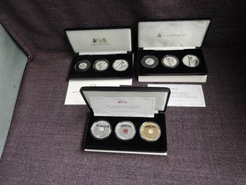 Two Jubilee Mint Three Coin Sets, 80th Anniversary of the Battle of Britain Fine Silver Proof Coin Collection and the 2020 Remembrance Day £5 Coin Collection, both with certificates, box and outer card sleeve along with a Harrington & Byrne 2020 80th Anniversary of the Battle of Britain Silver Proof 3-Coin Collection, with certificate, box and outer card sleeve