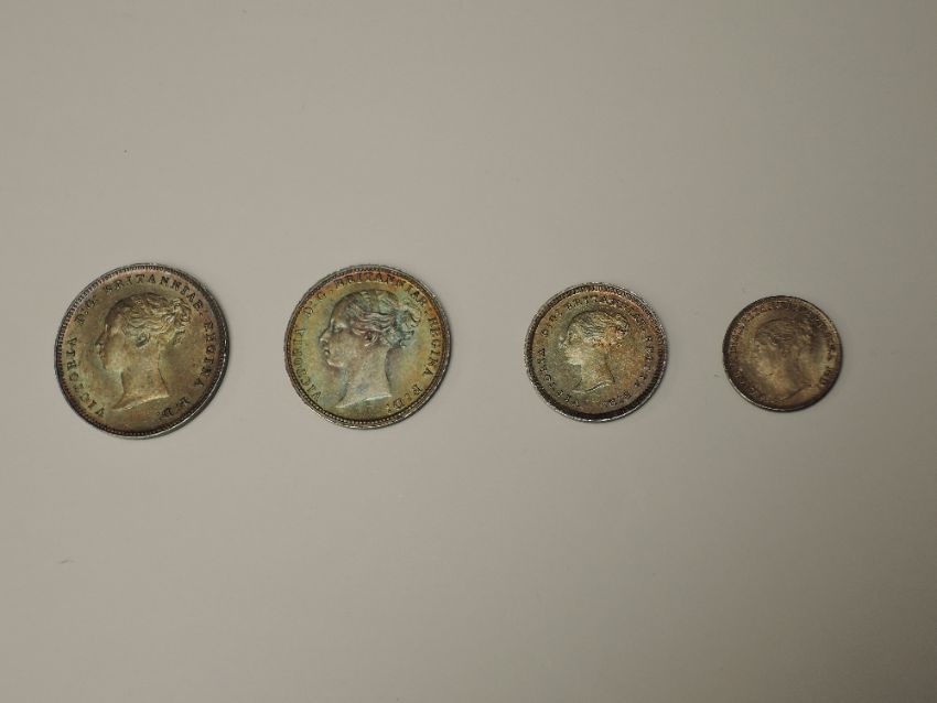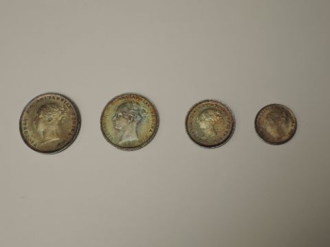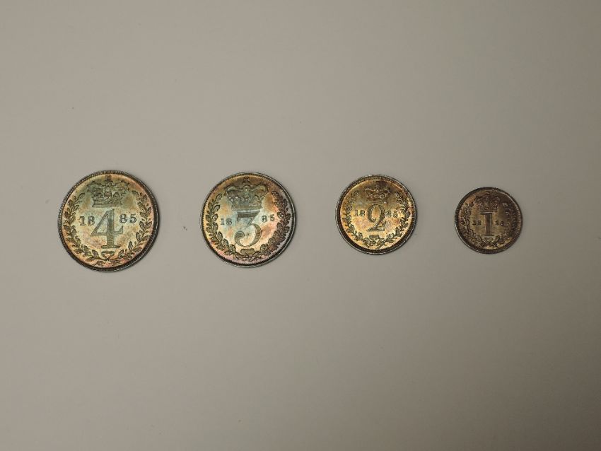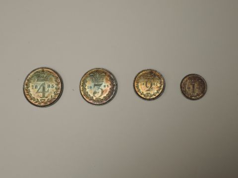 A set of 1885 Queen Victoria Silver Maundy Coins, Four Pence, Threepence, Two Pence and Penny