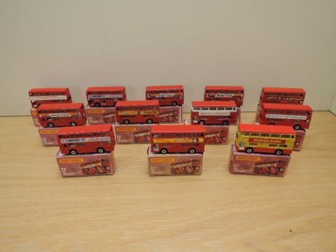 Twelve Matchbox Series Superfast Lesney 1974-1982 die-casts, all No 17 The Londoner in various liveries including Bisto, Round London Sight Seeing, Laker Sky Train, Were With The Woolwich, Preston Wine Festival 1975, Shop Linker in yellow & red, Swinging London etc, all boxes complete, models good