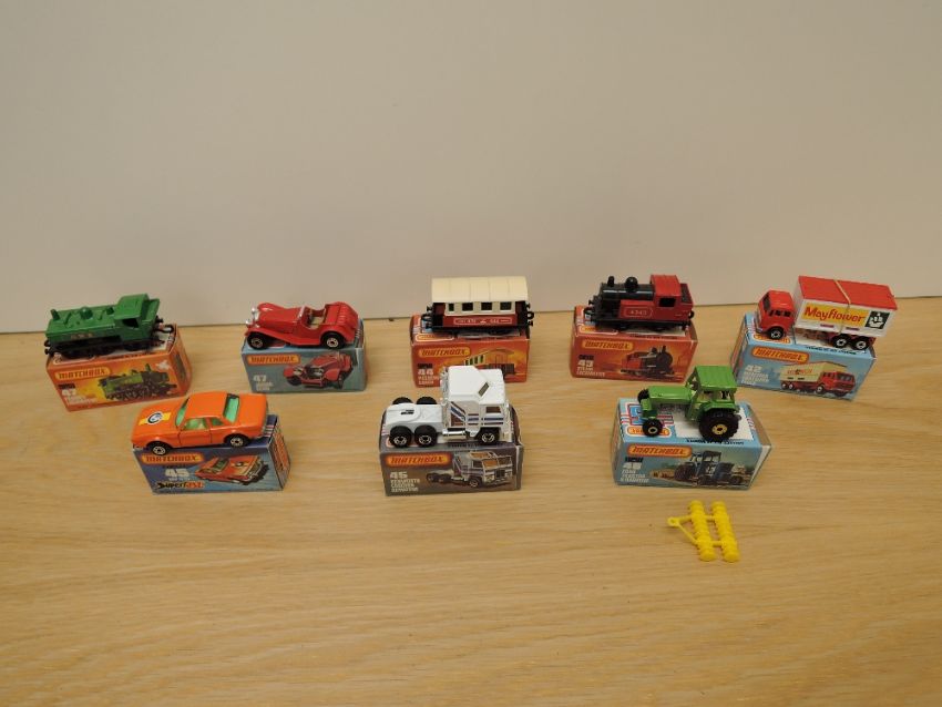 Eight Matchbox Series Superfast Lesney 1974-1982 die-casts, No 42 Mercedes Container Truck, red, Mayflower label, No 43 Steam Locomotive, red, No 44 Passenger Coach, red raised roof, No 45 Kenworth Cabover Aerodyne, No 45 BMW 30 CSL, orange, No 46 Ford Tractor & Harrow, green & yellow, No 47 Jaguar SS100 and No 47 Pannier Locomotive, all models in good condition, all boxes complete