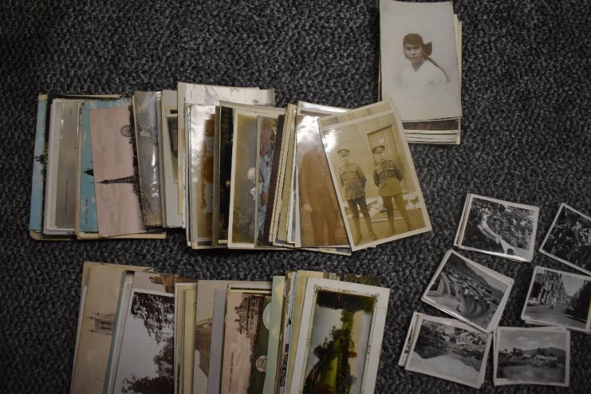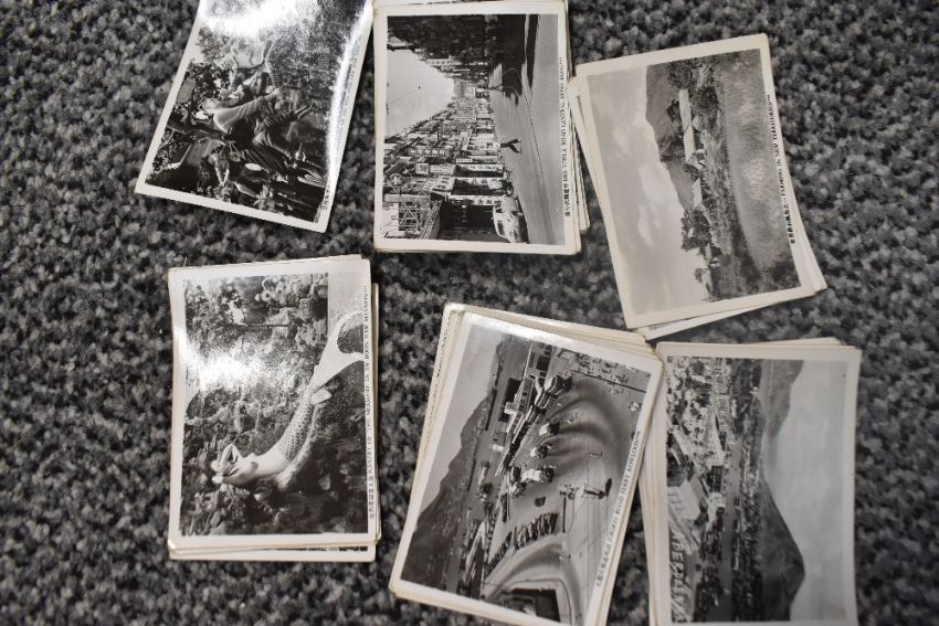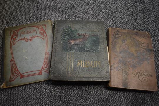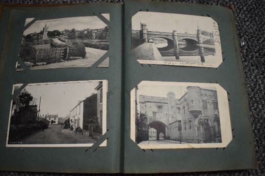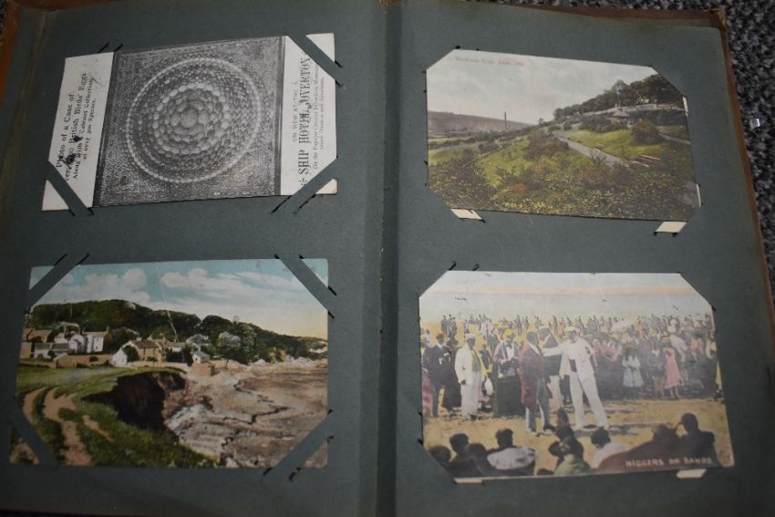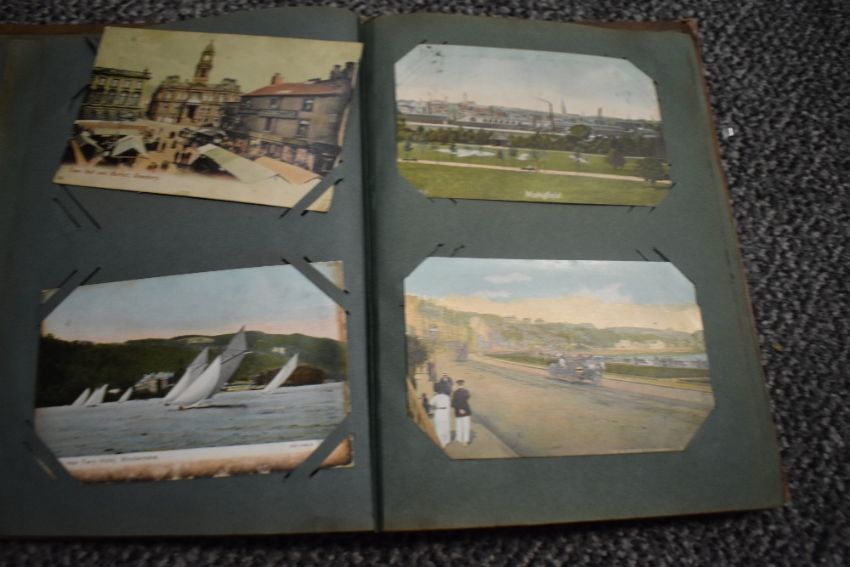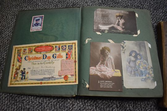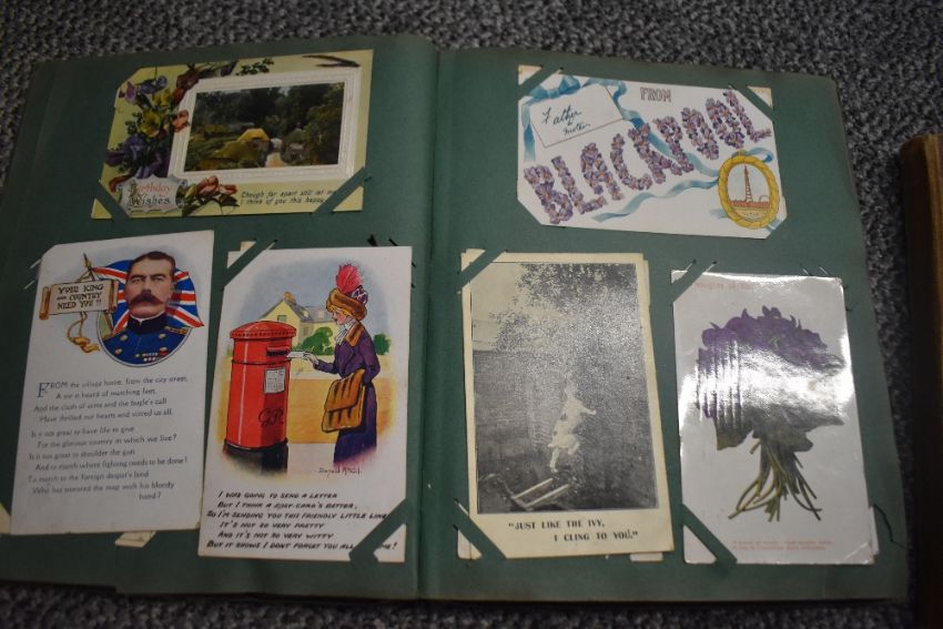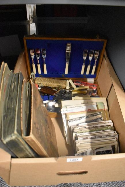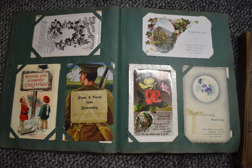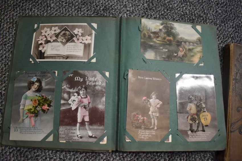 Three vintage postcard albums, two with contents, a selection of vintage postcards and birthday cards, and a small selection of flatware.