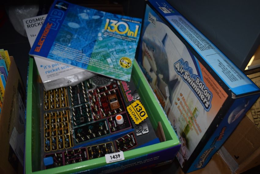 A selection of children's toys and science experiment crafts, including Pocket sized rocket, powered by baking soda and electronic lab.