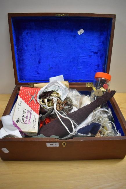 A mahogany box filled with as selection of mixed modern and vintage haberdashery.