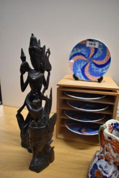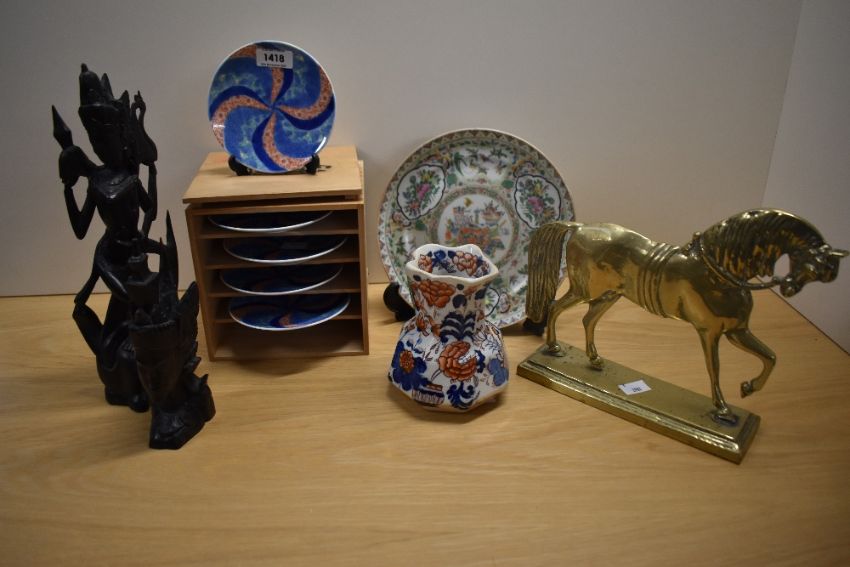 Two Balinese style hand carved figures, a set of five Meiji Imari style geometric plates, a Chinese Famille Rose style plate, a Mason's jug and a brass horse door stop AF.