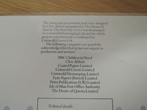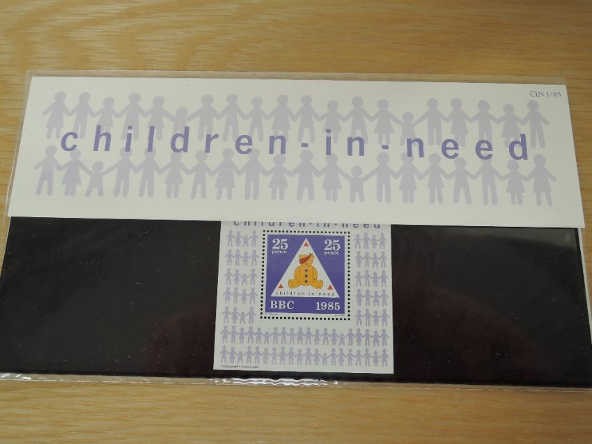 GB 1985, CHILDREN IN NEED PRIVATE ISSUE PRESENTATION PACK WITH PUDSEY BEAR MINIATURE SHEET Private issue presentation pack, with 25p Pudsey Bear Mini sheet, printed by Questa from 1985. Pack issued for Children in Need.