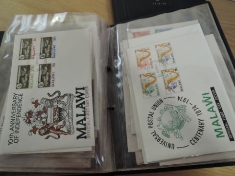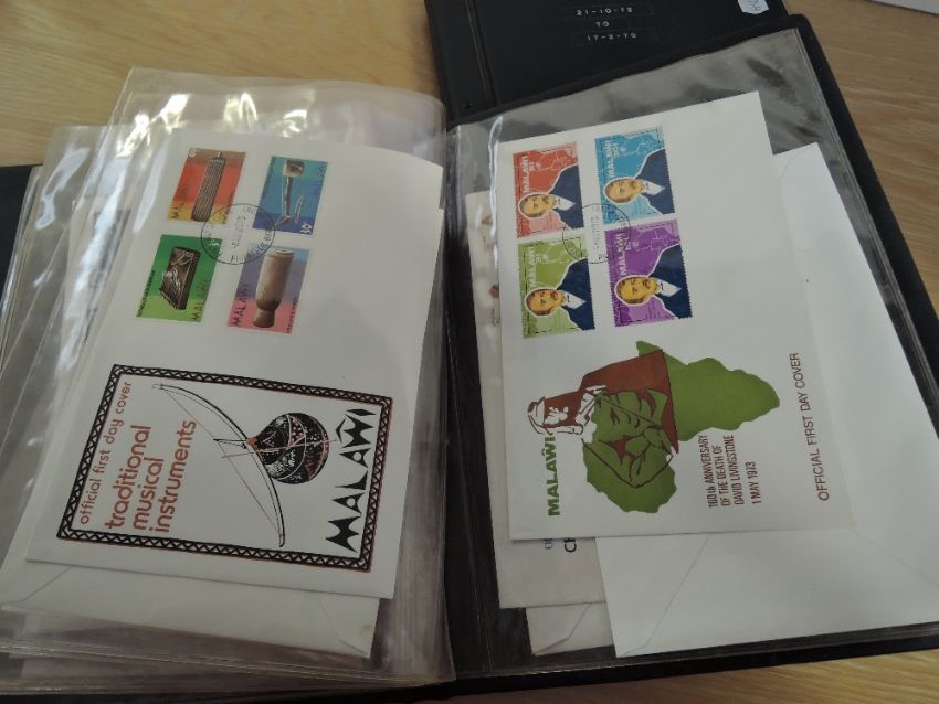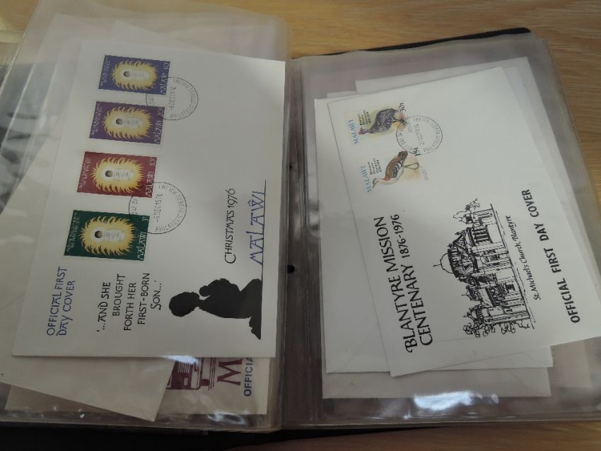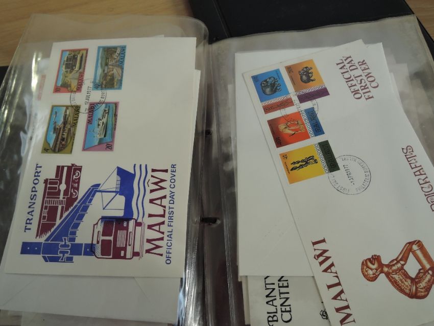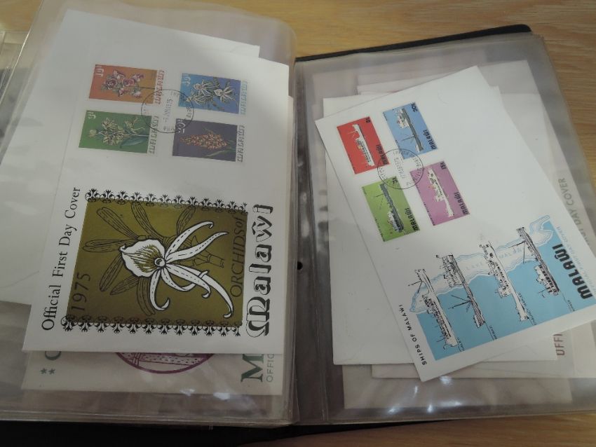 MALAWI COLLECTION OF 50+ ILLUSTRATED FIRST DAY COVERS DATING 1970's Two Malawi cover albums with a collection of estimated 50-60 illustrated first day cover from Malawi. All appear to date 1970's. Albums a little tatty, but contents fine and clean.