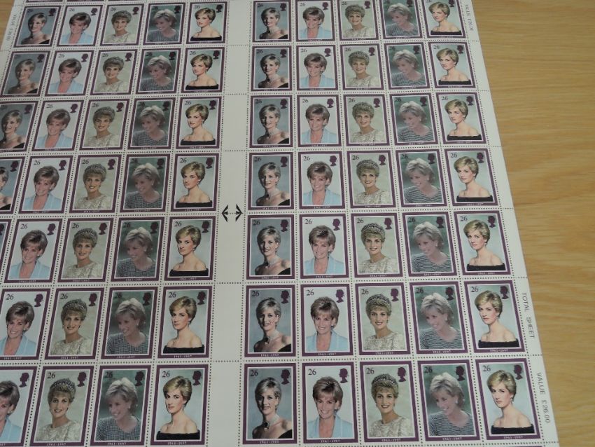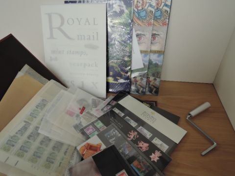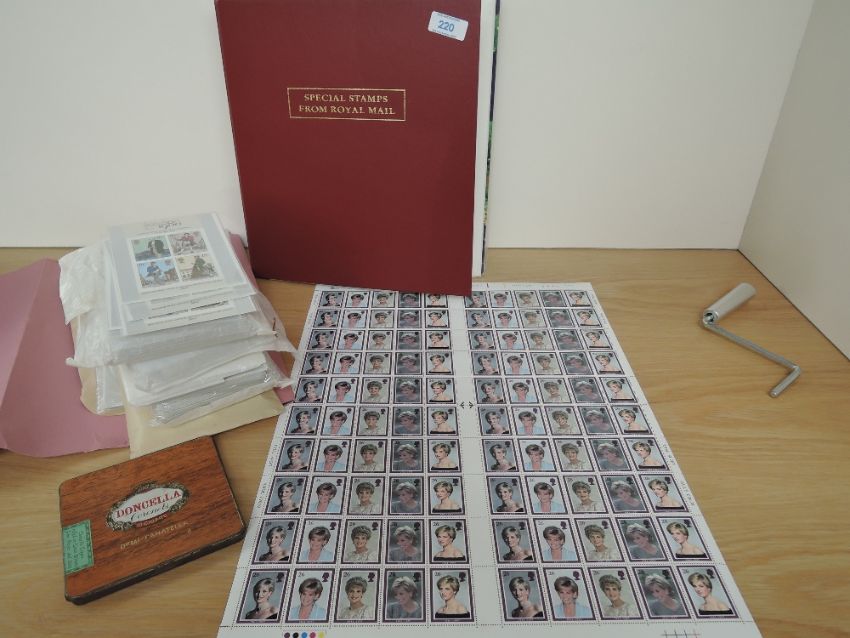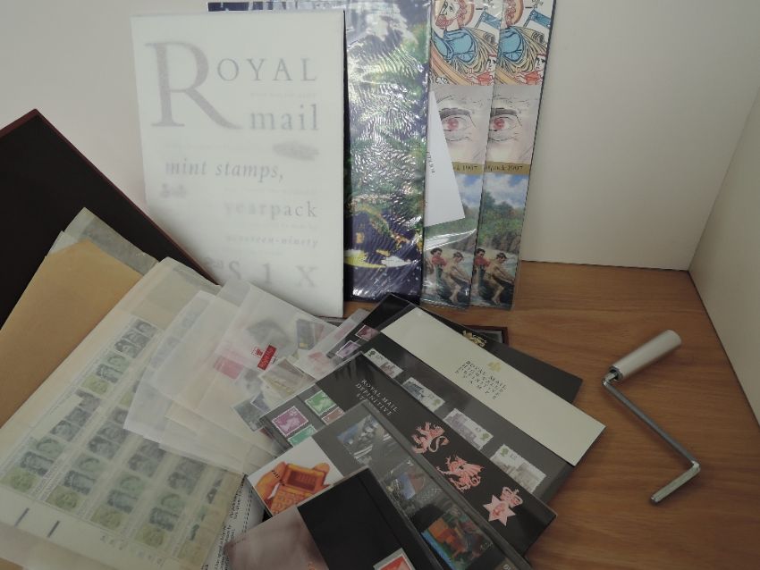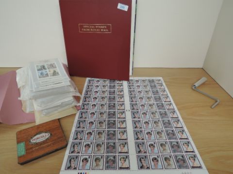 GB, COLLECTION OF PRES PACKS, LOOSE SETS, YEAR PACKS FULL SHEET & MORE. MNH Folder with ranges of GB flat sets, dating to around 2000, pres packs, 1996-98 Year packs, odd prestige booklet. In second pink folder, in excess of 100 Rowland Hill mini sheets, all identified by different plates, and minor flaws. Finally a full sheet of the 1990's Diana sheet, laid flat in full sheet size. Useful face in the region of a couple of hundred pounds plus.