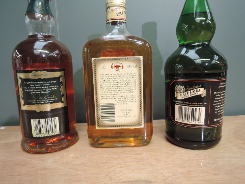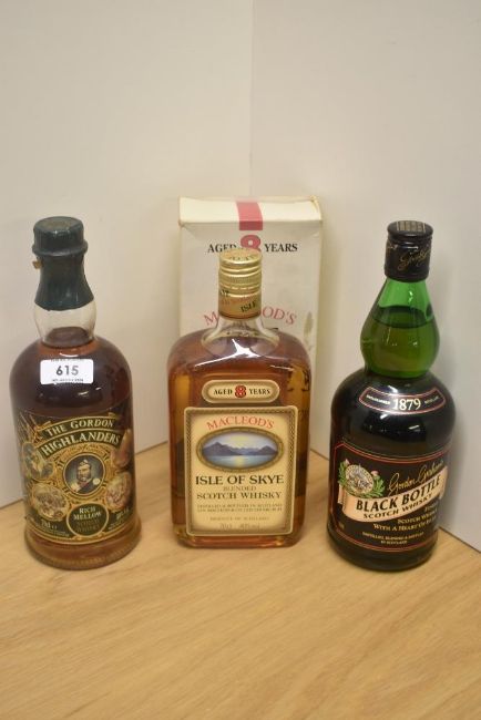 Three bottles of Blended Scotch Whisky, Macleod's Isle of Skye 8 Year, in original card box, Gordon Graham's Black Bottle and The Gordon Highlanders Rich Mellow, all 40% vol and 70cl