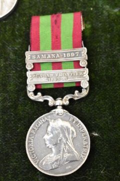 A Queen Victoria India Medal with two clasps, Punjab Frontier 1897-98 and Samana 1897 to 4123 PTE.W.Murphy.2nd.Bn.Royal Irish.Regt, This medal replaces the GSM for Campaigns in India 1895-1902
