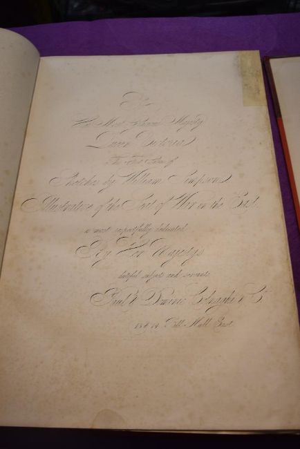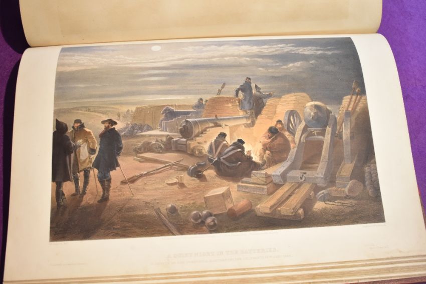 Two Volumes, Simpson's Sketches At The Seat Of War, The Seat Of War In The East by William Simpson, dedicated by permission to her most glorious Majesty The Queen, London 1855 published by Paul & Dominic Colnaghi & Co, Authentic Series, 1855 & 1856, 79 hand coloured lithograph plates in total, 40 in one 39 in the other along with each title page having a hand coloured lithograph plate, 81 in total, in two hard back volumes, foxing and damp damage to most pages but none seen on the plates, page size 38cm x 56cm