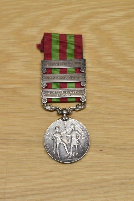 A Queen Victoria India Medal with three clasps, Punjab Frontier 1897-98, Samana 1897 & Tirah 1897-98 and ribbon to PTE P? 21st MADRAS PIONEEERS, India Medal for North West Frontier operations 1895-1902