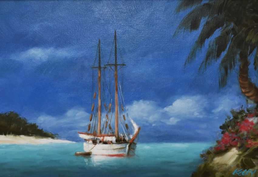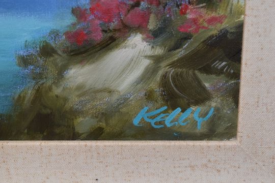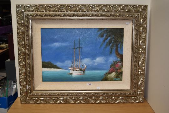 20th Century School, oil on canvas, A moored yacht within a Mediterranean style landscape, signed 'Kelly' to the lower right, displayed within a silver coloured and moulded frame, measuring 42cm x 58cm, & 72cm x 92cm overall