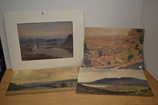 Edward Arden (1830-1909, British), watercolour, A moonlit estuary landscape, signed to the lower left, unframed, mounted, measuring 30cm x 35cm, & 45cm x 50cm overall, together with three other watercolour paintings on paper, two signed C.J Kennedy (20th Century), the other depicting the Skiddaw hills (4)