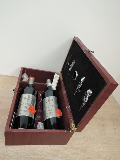 A Two bottle set of Magnvs, Montekristo Vineyard Malta Red Wine, 2005 numbered 00467, 2004 numbered 01018, both in presentation box with vine accessories