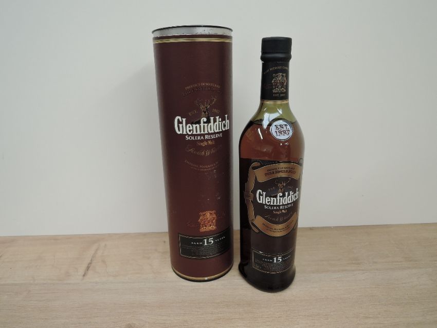 A bottle of Glenfiddich 15 Year Old Solera Reserve Single Malt Scotch Whisky, 40% vol, 70cl, in card tube