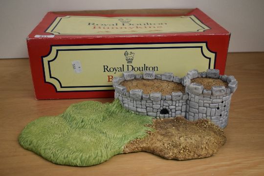 A Royal Doulton Bunnykins 'Robin Hood Collection' castle form display stand, with original packaging.