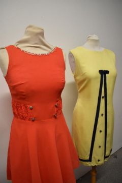 Three 1960s dresses, including lemon yellow linen dress with navy grosgrain bow detail and orange mini dress with shirred panels to bodice.