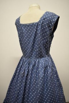 A 1940s/50s cotton day dress, in corn flower blue with tiered skirt and side metal zip, some nipping to hem.
