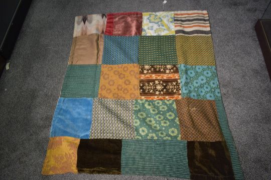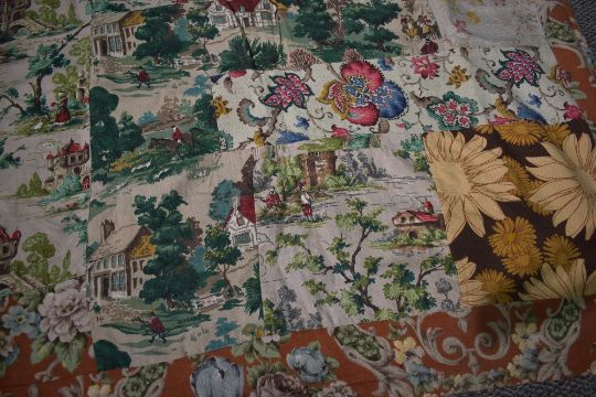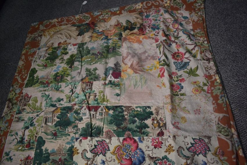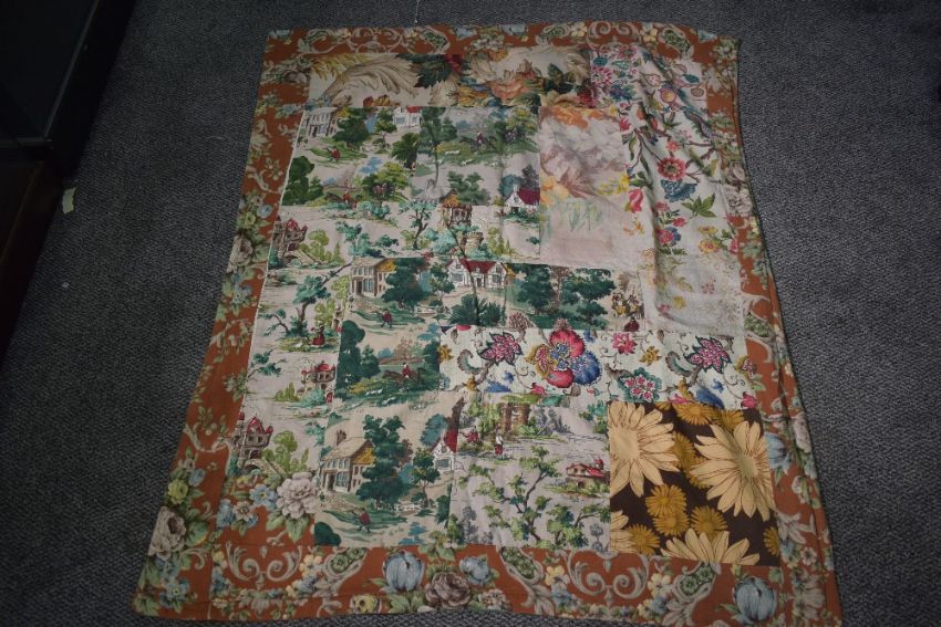 A small patchwork bed throw, using various bark cloths and velvets etc to one side and florals and scenic fabrics to the other.