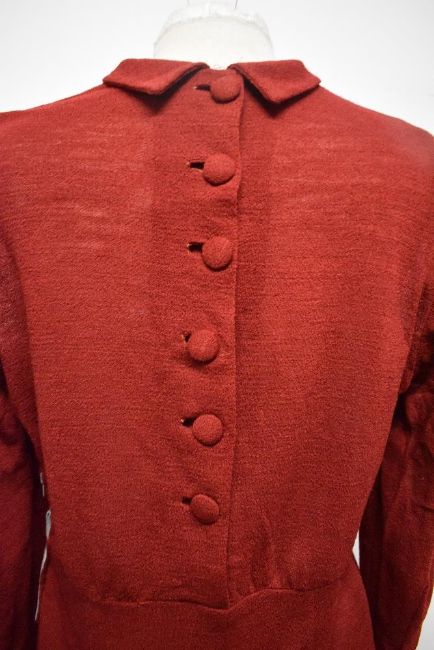 A russet coloured 1940s day dress, having long sleeves, pockets to bodice with angular stitched detailing, self covered buttons to reverse and vents to skirt, large size, replacement zip required.
