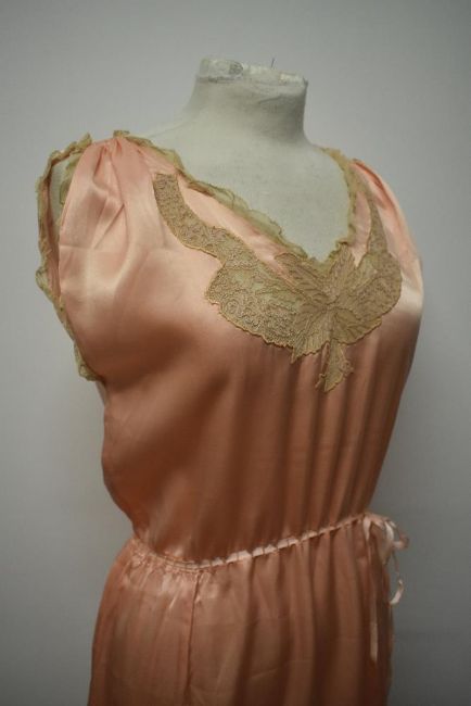 A 1920s pale pink silky 1920s nightdress, having adjustable ribbon fastening to waist, pretty lace inserts to bodice and tulle to arm openings, bodice and hem, superb condition, medium size.