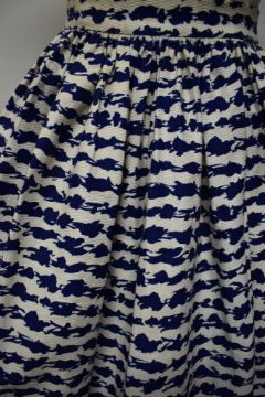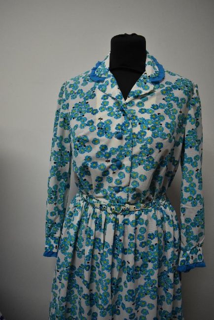 A 1950s abstract patterned textured cotton skirt, a 1960s dress having pink gingham and floral pattern and a 1960s blue floral day dress with belt.