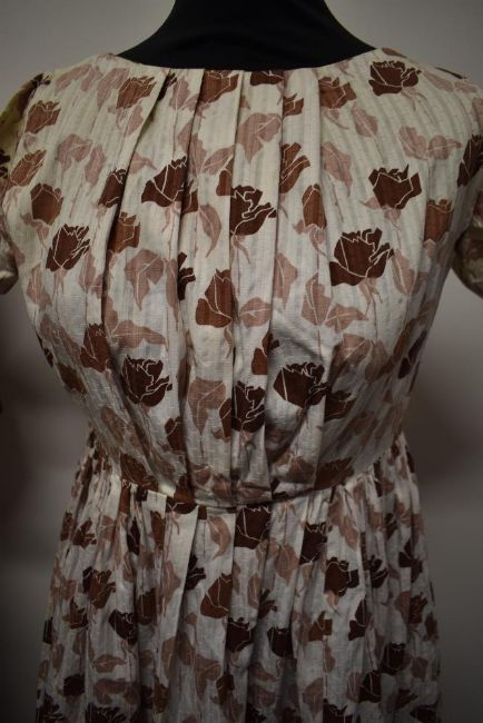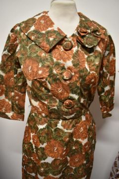 A 1960s autumnal print Trevira dress and a 1950s abstract roe patterned cotton day dress.